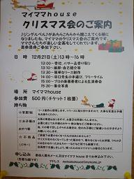 クリスマス会 公開済み: 2013年12月3日更新: 2017年2月15日作成者: maymamaカテゴリー: マイママ, マイママBLOG いよいよ12月になりましたね。 マイママhouseもクリスマスの装飾を始めました。 12月21日(土)にママさんたちがクリスマス会を企画してくれました。 ビオラの生演奏あり、リース作りあり、谷口先生の手遊びや読み聞かせありと楽しいことが盛りだくさんです。 ぜひマイママhouseへお越しください。 先着16組です。 お申し込みはお早めに・・・
