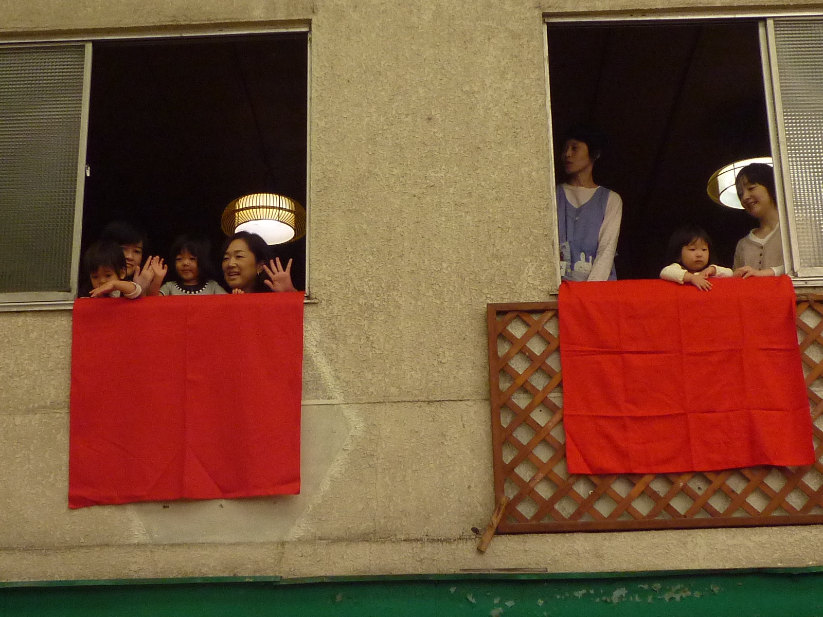 子どもたちが2階からかわいい手を振ると、そこに粽を投げ入れてくれるのです